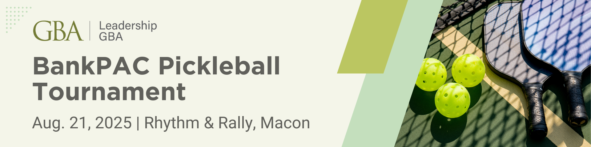 We are thrilled to announce that GBA is partnering with Rhythm & Rally Sports & Events in Macon, GA to host their first-ever GBA BankPAC Pickleball Tournament on August 27, 2026. Proceeds will go to the GBA StatePAC*.